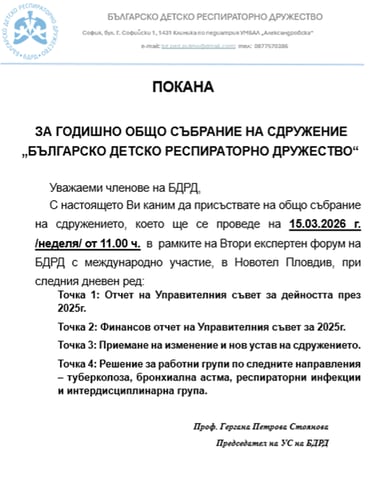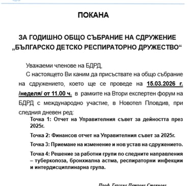 С настоящето Ви каним да присъствате на общо събрание на сдружението, което ще се проведе на 15.03.2026 г. /неделя/ от 11.00 ч. в рамките на Втори експертен форум на БДРД с международно участие, в Новотел Пловдив, при следния дневен ред: